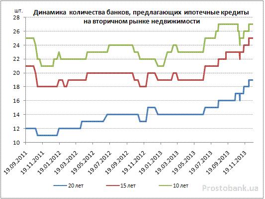 Первое позитивное изменение – то, что выбор кредиторов увеличился на треть для вторички и почти на 20% для первички. Так, по данным компании Простобанк Консалтинг, за последний год количество учреждений из числа 50-ти лидеров по активам, выдающих займы на покупку жилья на вторичном рынке недвижимости сроком на 10 и 15 лет увеличилось на шесть – до 27 и 25 банков соответственно, а сроком на 20 лет – увеличилось на пять и составило 19 банков. В сегменте кредитов на покупку жилья на первичном рынке увеличение составило четыре учреждения; в начале 2013 года такие кредиты сроком 5 и 10 лет предлагают 19 банков из 50-ти крупнейших, сроком 15 лет - 17 банков, сроком 20 лет – 11 банков (по состоянию на 27.12.2013 г.).