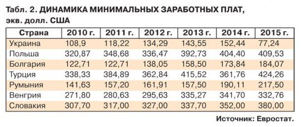 Исследование информационно-аналитического центра Info-Light говорит о том, что после экономического кризиса 90-х и до 2015 г. в Украине уровень минимальной заработной платы в основном рос не только номинально, но и реально. О чем свидетельствует в том числе и динамика минимальной заработной платы по отношению к курсу доллара. Исключением был лишь 2009 г., когда после экономического кризиса курс доллара поднялся с 5 до 8 грн. Наибольший скачок заработной платы в долларовом эквиваленте состоялся в 2007-м — практически на 30%. Так как в течение 2005–2008 и 2010–2014 гг. курс гривни был номинально стабилен, на начало 2014-го минимальная зарплата достигла долларового максимума за всю историю Украины — 152 долл. (1218 грн при курсе 7,99 грн./долл.). Однако за прошедший год ситуация изменилась в корне. По состоянию на начало года минимальная заработная плата опустилась до 77 долл., а 1 марта достигла минимального за 12 лет значения в валютном выражении — 43,8 долл.