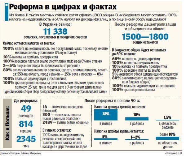 В соответствии с реформой, местная власть должна полностью обеспечивать медицинские и образовательные учреждения. После перераспределения доходов от природных ресурсов (раньше в местном бюджете оставалось 50%, теперь только 25%) есть опасения, что местного бюджета хватит только на зарплаты врачам и учителям. Кабмин обещает доработать механизмы проведения реформы и утверждает, что перспективные планы областей не являются руководством к действию.