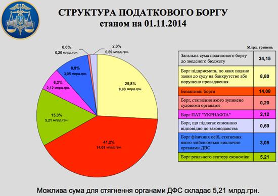 С начала 2014 года налоговый долг предприятий увеличился более чем в два раза. По словам Билоуса, если в начале 2014 года он составлял около 15,5 млрд грн, то 1 ноября 2014 года его объем достиг 34,1 млрд грн.