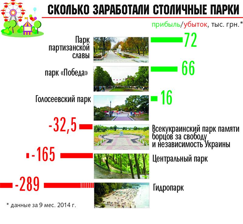 В мэрии считают, что создание нового КП над дирекциями парков заставит менеджеров работать активнее и привлекать инвестиции для их развития. Что им до этого мешало заниматься поиском денег и развивать подопечные объекты, непонятно. Но вариант увольнения нерадивых директоров парков, которые довели их до ахового состояния, власти почему-то не рассматривают. Согласно отчету департамента коммунальной собственности КГГА за три квартала 2014 г. шесть парков культуры и отдыха совокупно принесли городу 330 млн грн. убытка. При этом в плюс работали Голосеевский, Парк партизанской славы и "Победа", результаты финансовой деятельности которых составили 16 тыс., 72 тыс. и 66 тыс. грн. соответственно. Больше всего убытков (289 тыс. грн.) пришлось на Гидропарк и Центральный парк - 165 тыс. грн.