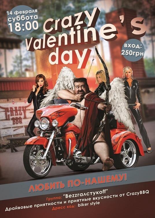 В Crazy BBQ будут признаваться в любви по-байкерски. Для всех Crazy-влюблённых в этот день только хиты от кавер- группы «Bezzгалстукоff», драйвовые приятности и угощения от Crazy BBQ! Начало вечера в 18:00, стоимость входного билета – 250грн. Дресс код – biker style.