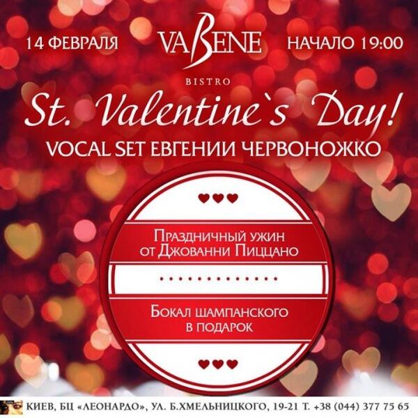 В программе вечера итальянского ресторана Va Bene bistro праздничный ужин от бренд-шефа Джованни Пиццано и Vocal set от Евгении Червоножко. Для всех гостей бокал шампанского в подарок. Начало в 19:00.