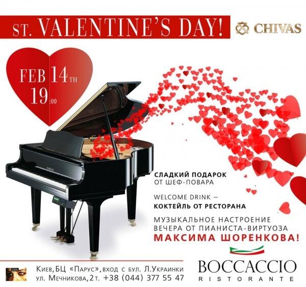 За музыкальное настроение вечера в Boccaccio будет ответственен пианист-виртуоз Максим Шоренков. Всех гостей ждет воздушная терраса, россыпь из лепестков роз, легкое мерцание свечей и, конечно же, специальные блюда с афродизиаками от шеф-повара! Всем в подарок десерт и коктейль от ресторана. Начало в 19:00.