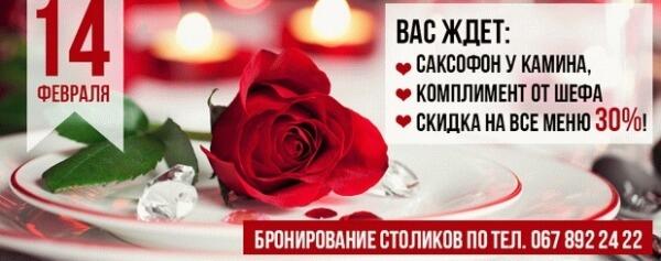 В самый романтичный день года банкет-холл Nivki-hall приглашает всех влюбленных посетить вечеринку «Любовь, вино и джаз». В стоимость билета входит место за столиком, бутылка грузинского вина Tamada и фруктово-шоколадная тарелка. Также каждый гость сможет бесплатно выбрать два напитка из коктейльного меню заведения. Всех, кто будет отмечать праздник в Nivki-hall, ждет винная дегустация от Adamanti, праздничная фотозона, шоколадные фонтаны, розыгрыши, викторины и сюрпризы с общим призовым фондом более 5000 грн. Стоимость билета – 300-400 грн.