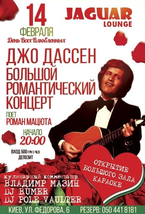 Всех гостей ресторана ждет выступление Романа Мацюты, музыканта, лидера украинской рок-группы Rosemary. Он исполнит известные хиты Джо Дассена. После – дискотека от Dj Bumer, Dj Pole Vaulter. Начало в 20:00.