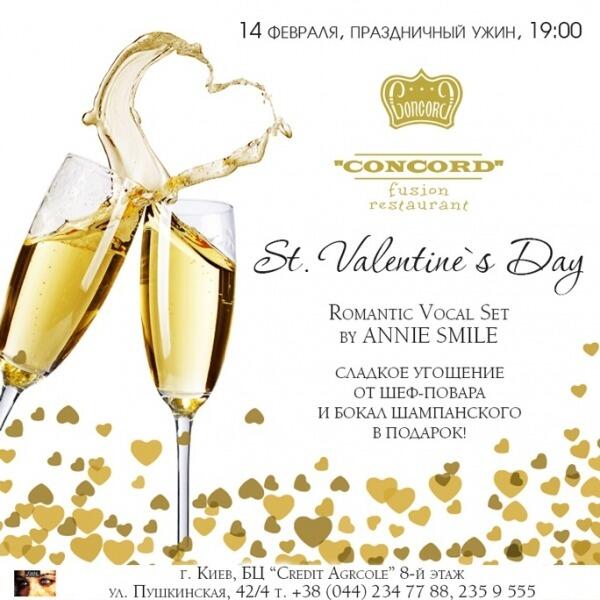 Для всех гостей ресторна Concord угощения от шеф-повара и бокал шампанского в подарок! Всех влюбленных и не только ждет романтическое выступление Annie Smile. Начало праздничного ужина в 19:00.
