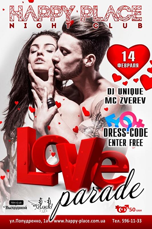 В клубе Happy Place 14 февраля состоится Love Parade!Играют резиденты – Dj Unique, MC Zverev. Стоимость для мужчин и женщин – 50 грн.