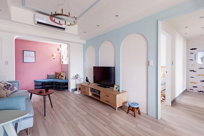 Квартира с типичной планировкой и не большой жилой площадью украшена мягкими цветовыми акцентами, а интерьер уставлен множеством предметов интерьера. Большое количество цветов и текстур даже на маленьком пространстве создают ощущение простора и уюта. Однако няшно-игрушечная стилистика оформления не позволяют воспринимать этот интерьер как что-то действительно жилое — скорее как простой выставочный образец или шоурум очередного дизайн-ателье.