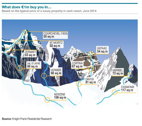 В докладе, посвященном Индексу недвижимости на горнолыжных курортах, отмечается, что за один миллион евро в Куршевеле – одном из самых дорогих курортов Европы - можно купить квартиру площадью всего 50 кв. м, в то время как в Шамони зa эти деньги можно позволить себе апартаменты площадью 117 кв. м.