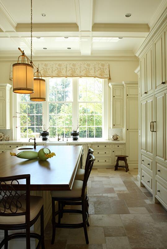 В английской кухне обязательно должны свободно поместиться объемная плита или печь, всевозможные шкафчики и витрины, раковина, остров. Все это наполнение устанавливается вдоль стен на некотором расстоянии от стола, будто опоясывая его, чтобы свободному передвижению ничего не мешало.