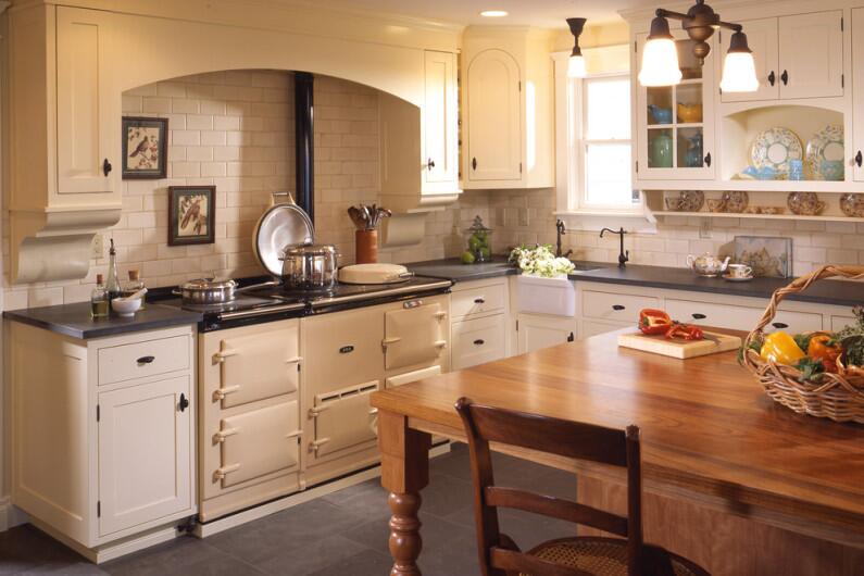Среди всей бытовой техники на виду, как бы то ни было, всегда остается плита, в английском интерьере олицетворяющая нечто большее, нежели просто варочную поверхность. Ее следует как-то выделить среди остального кухонного оборудования, и англичане с успехом справляются с задачей. Они обязательно дополняют плиту вытяжкой, которую искусно прячут в крупном декоративном коробе. Композиционно это выглядит, как полноценная печь – символ нерушимых английских традиций и семейного очага.