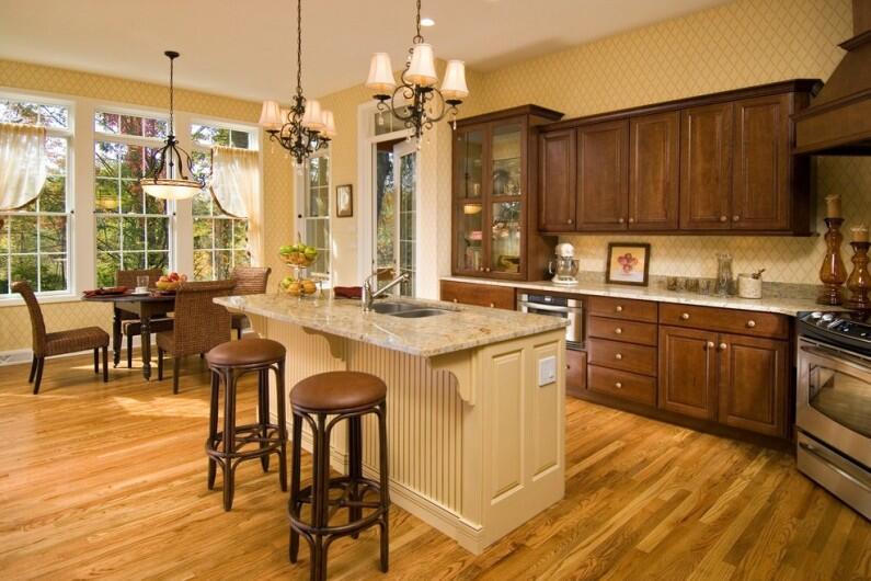 В облицовке пола следует использовать дерево в виде досок, паркета с геометрической раскладкой. Покрытие может быть плиточным или из камня, которые, также, применяют для облицовки рабочего фартука.