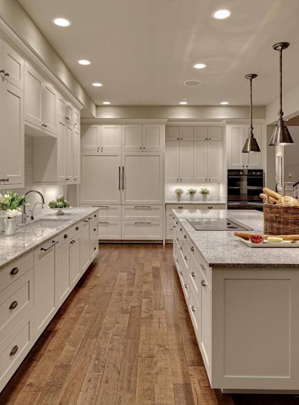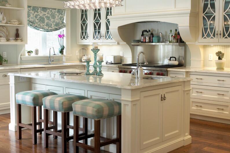 Столешницы в рабочих зонах, защитные фартуки выполняют из натурального или искусственного камня, что делает интерьер кухни поистине долговечным и очень практичным.