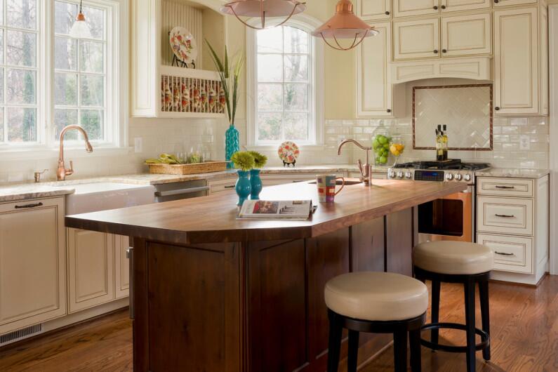 Особенное внимание в английской кухне уделяется дереву, как основному материалу для мебели, стеновых панелей, пола, декоративных элементов. При этом, используют предпочтительно массивы пород высшего качества: дуб, бук, тис, орех.