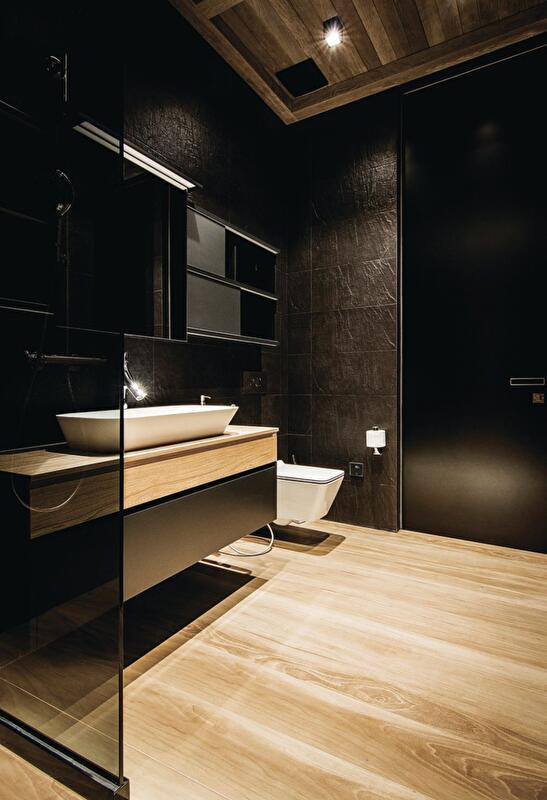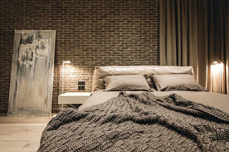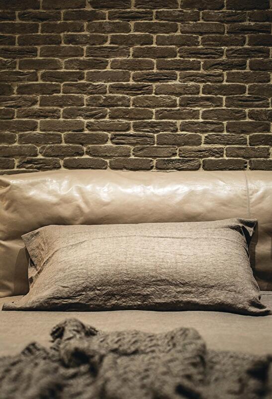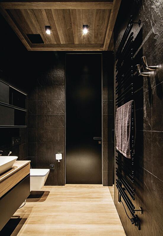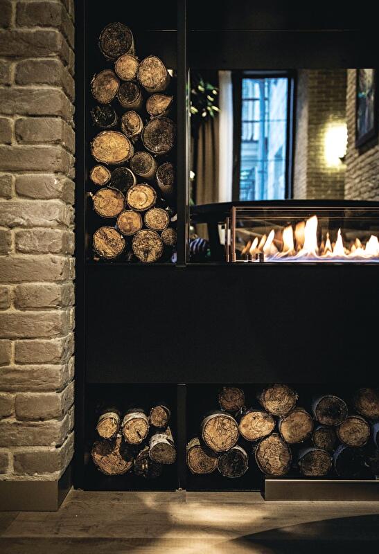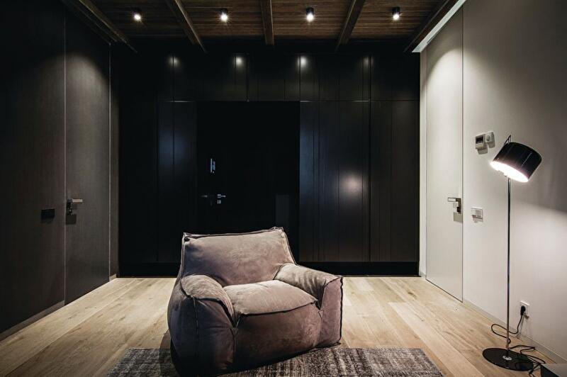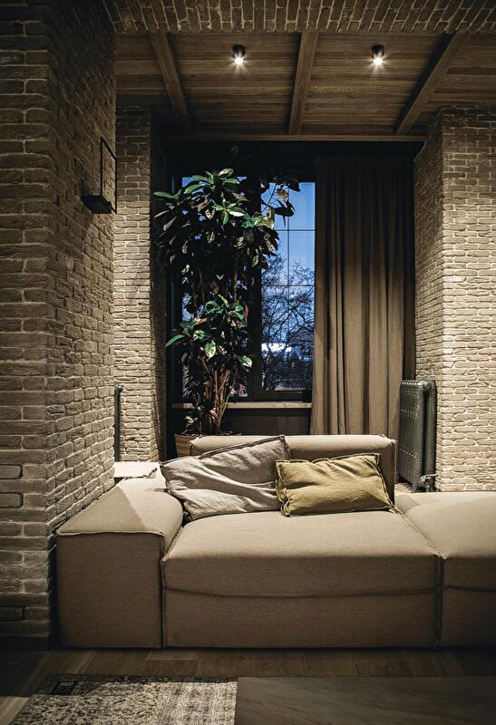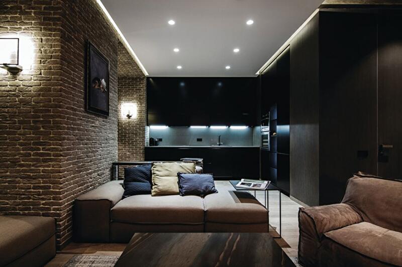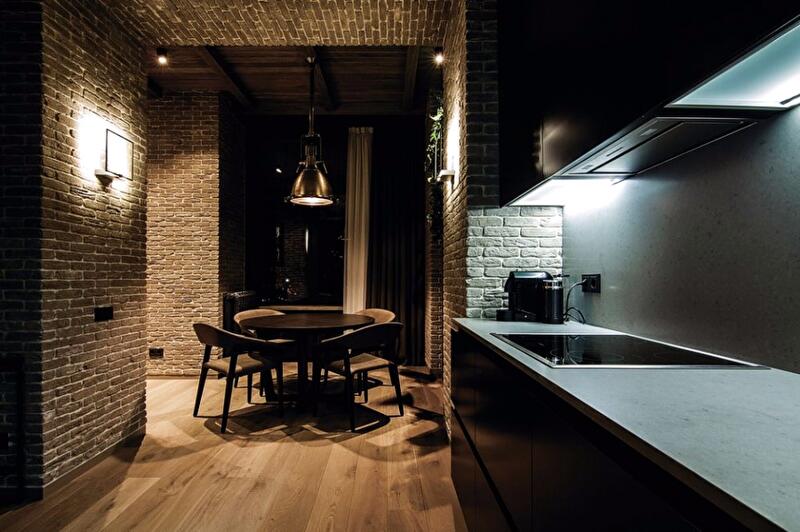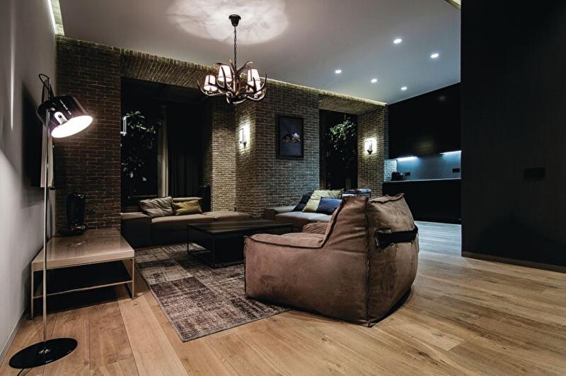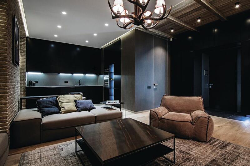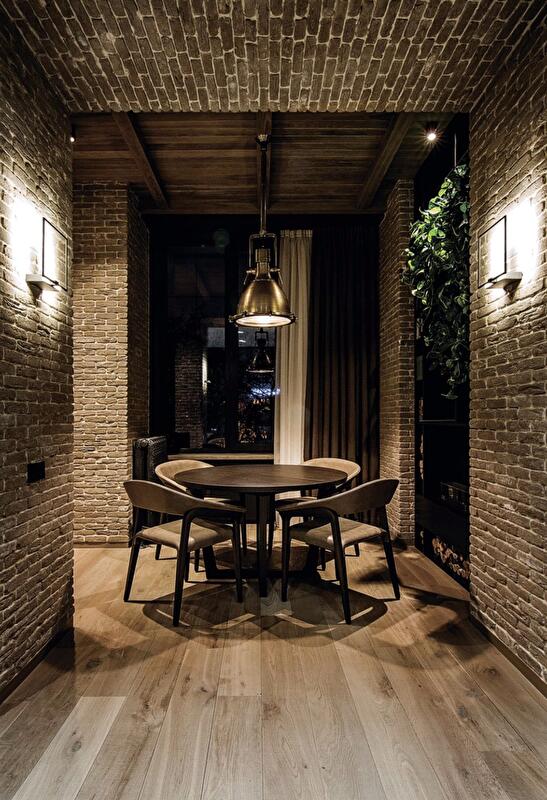 Интерьер построен на умелом сочетании черно-белых тонов. Стены, облицованные кирпичом, дизайнерская стильная мебель из дерева, камин, а также оригинальные арт-объекты, в число которых можно отнести и люстру из оленьих рогов, создают приятную атмосферу тепла и комфорта.