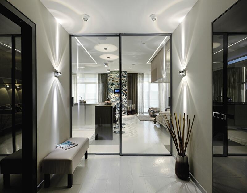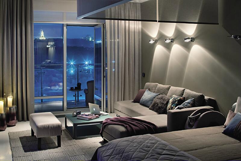 Стилистически пространство представляет собой спокойный элегантный minimal. Мебель, освещение и текстиль от авторитетных брендов с проверенной дизайн-родословной дают нужный «манхэттенский» тон: роскошь хорошей эргономики, воплощенной в натуральных материалах и тактильно привлекательных текстурах. Почти монохромный колорит в оттенках саванны освежают блики хромированных деталей – и «водное» панно работы Вячеслава Маевского в простенке между двумя окнами. Продолжая в интерьере тему днепровских волн, панно также является своего рода осью пространства, его «точкой сборки», и видно отовсюду – напрямую или же в зеркальных отражениях.