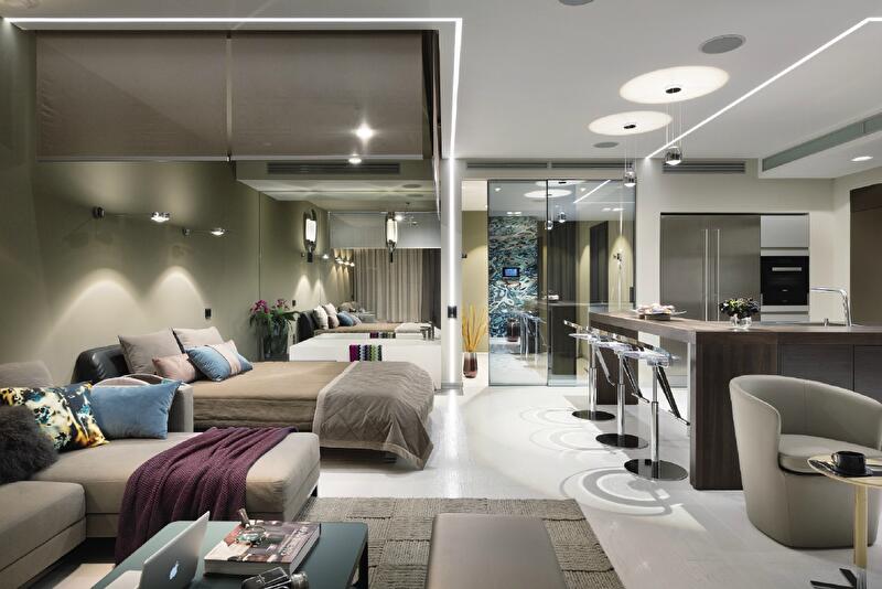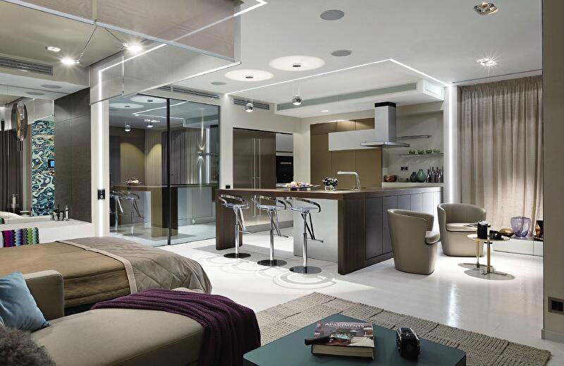Таким образом, гостиная, кухня, столовая, спальня и ванная соседствуют в едином жилом ансамбле. Отделены только входная группа и санузел. Границы кухонного блока дополнительно очерчивает полуостров с примыкающей барной стойкой, а спальня с ванной при необходимости вообще могут быть скрыты за опускающимися ролетами (простой и остроумный трюк!).