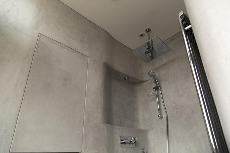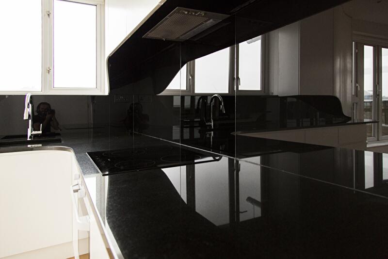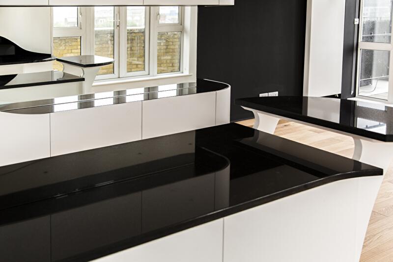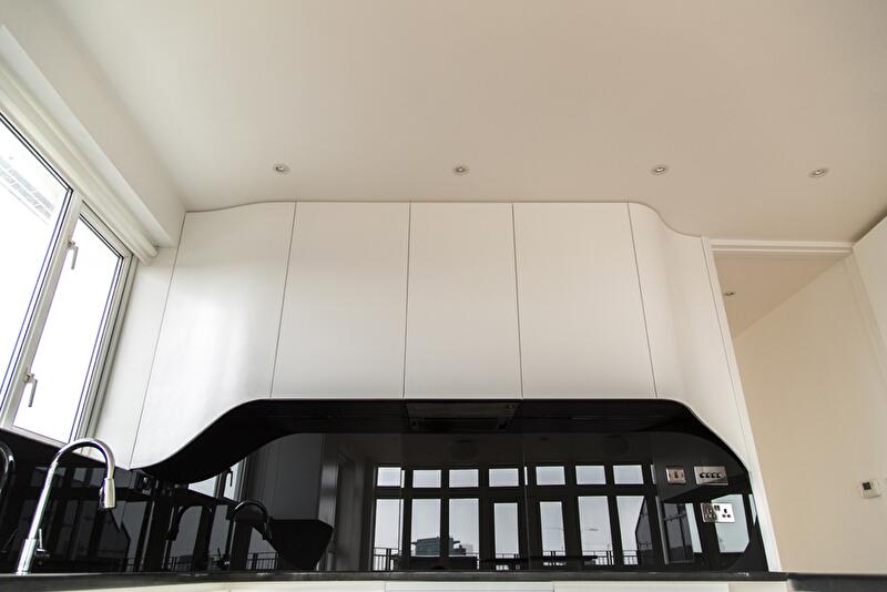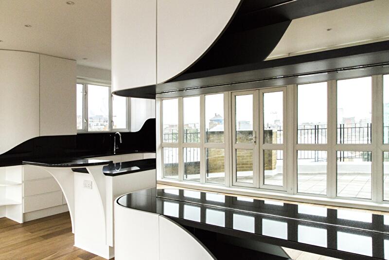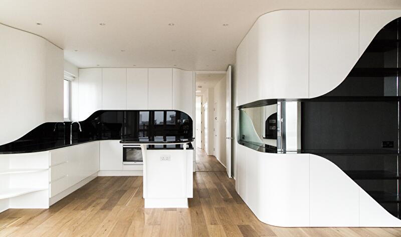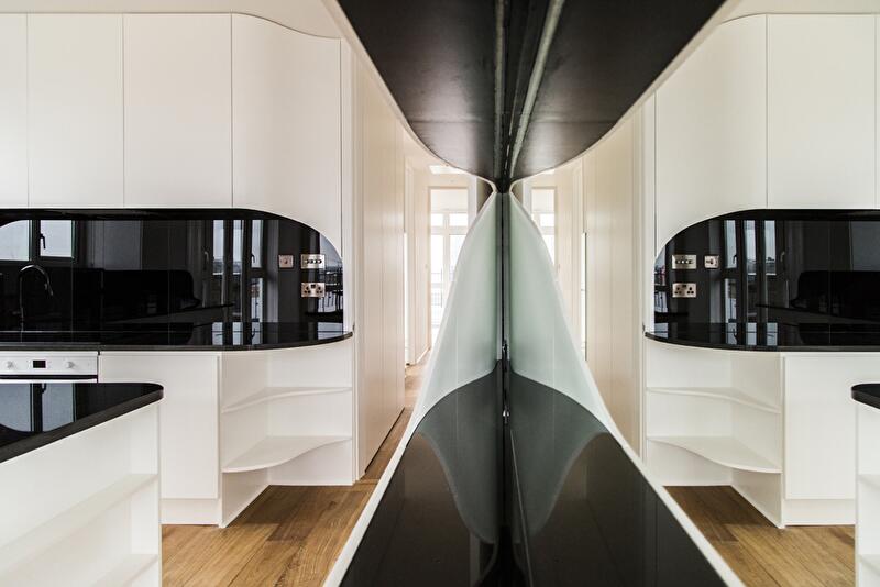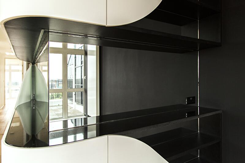 Интерьер пентхауса представляет собой череду перетекающих друг в друга помещений без перегородок. Только спальня с ванной комнатой отсечена от зоны дневного пребывания глухой стеной. В основе дизайнерской концепции лежит идея расходящегося шва, который обнажает изнанку материала. Так, белые края словно бы расходятся в разные стороны, и появляется черная полоса, «бегущая» по стенам и горизонтальным поверхностям (столешницы, консоли).