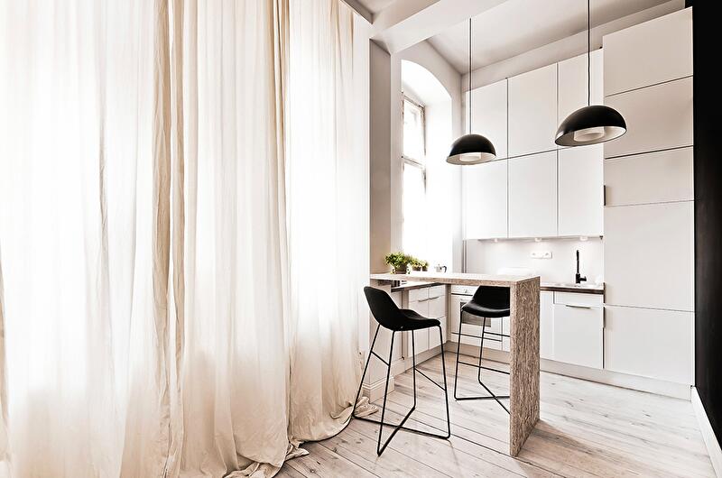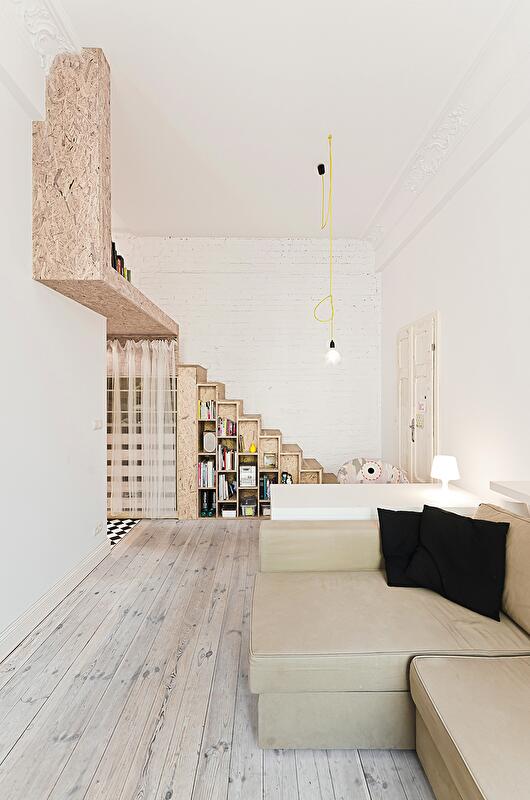 Перед архитекторами стояла непростая задача — максимально увеличить пространство и создать независимую спальню. Главным достоинством помещения стал высокий потолок в 3,7 метра, который хоть и не позволил выделить полноценный второй этаж, но открыл возможность по обособлению спального места. Оно было организовано над ванной комнатой, а кухня, столовая и гостиная объединены в единое открытое пространство.