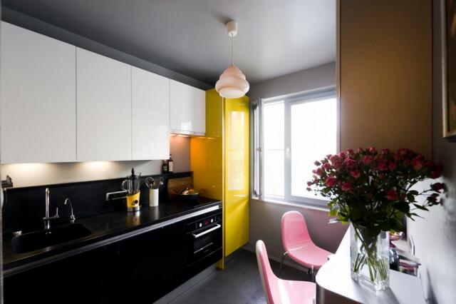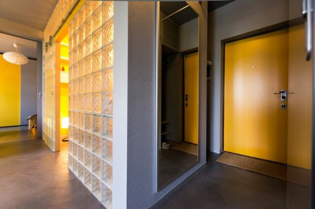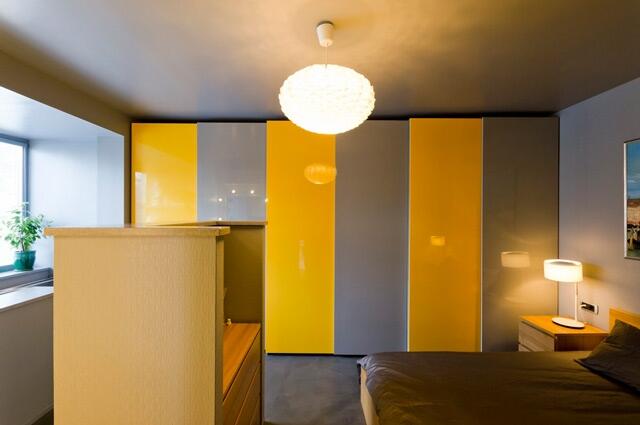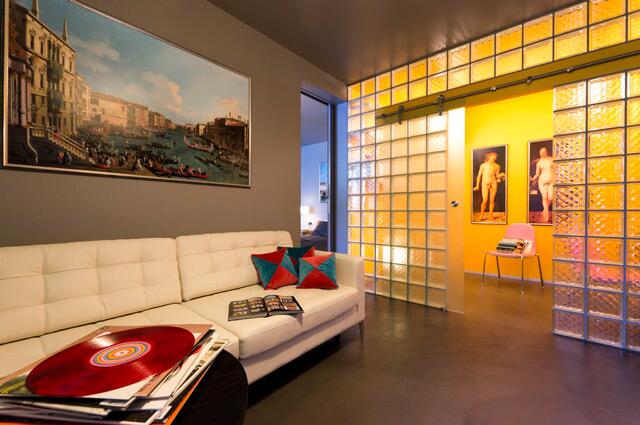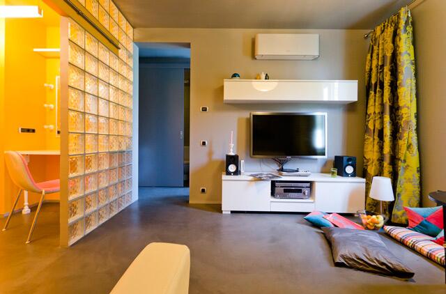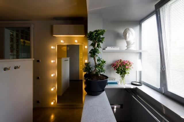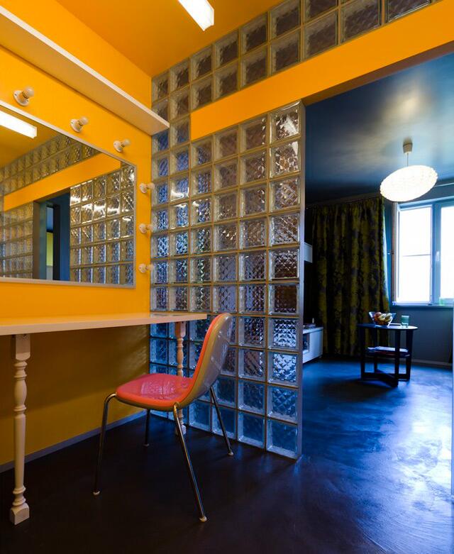 Так, после перепланировки был перенесен вход в спальню и снесена стена, которая разделяла коридор и большую комнату. Все это было сделано для того, чтобы выделить площадь под рабочий кабинет, в котором можно было бы легко поместить массажный стол и необходимое для косметолога оборудование. Перегородку было решено сделать из прозрачных стеклоблоков, поскольку они прекрасно пропускают свет (до 80%) и отлично скрывают, то, что происходит за ними. В интерьере много серого разбавленного желтым и розовым, первый – намеренно выбран дизайнерами, чтобы подчеркнуть зрелость пространства, с помощью желтого и розового добавили мягкость и немного инфантильности. ![]()
