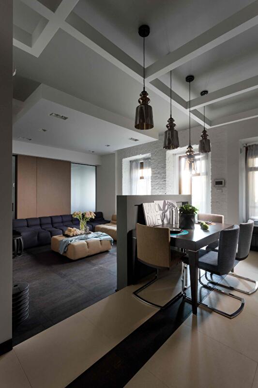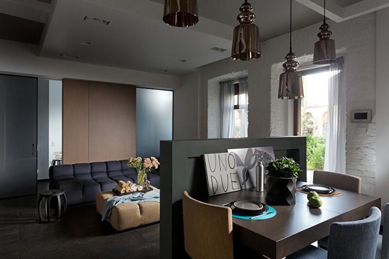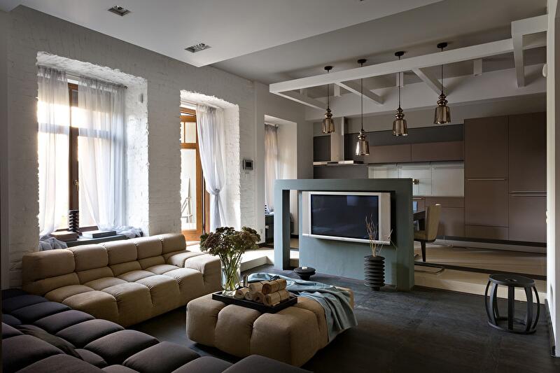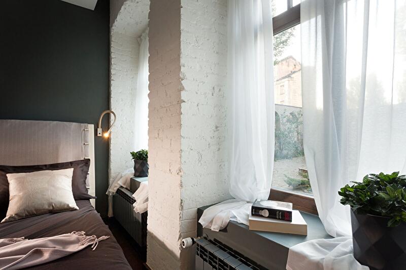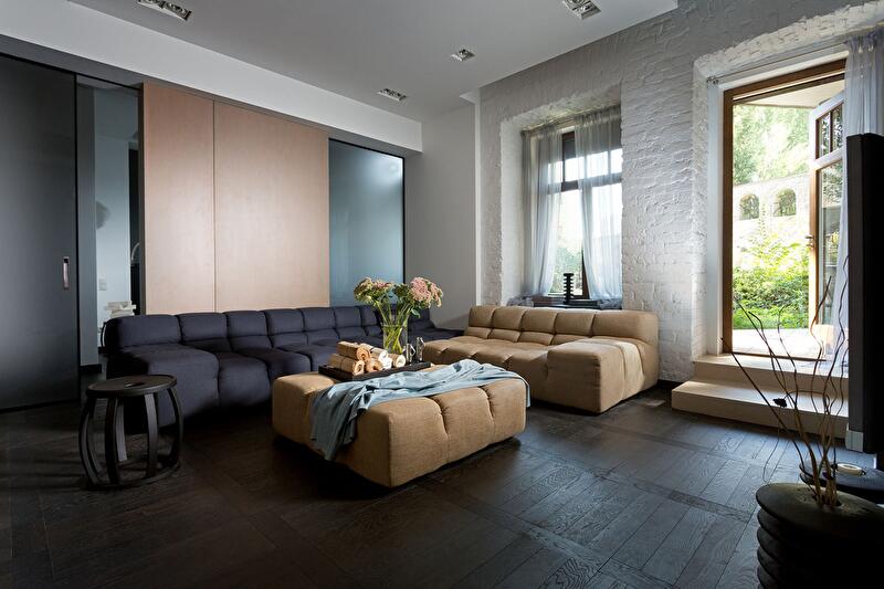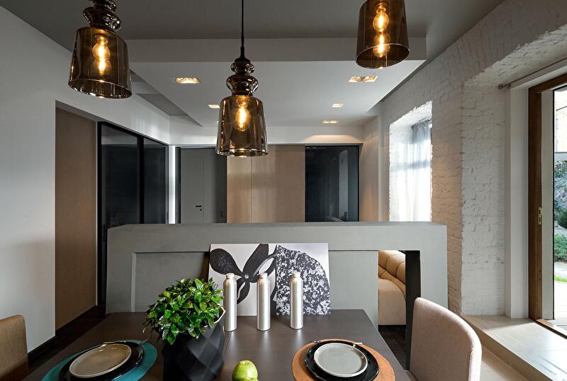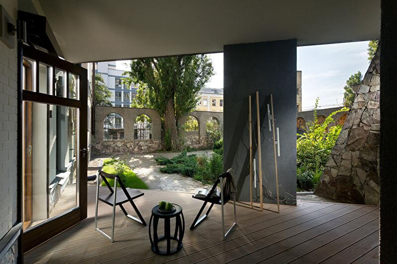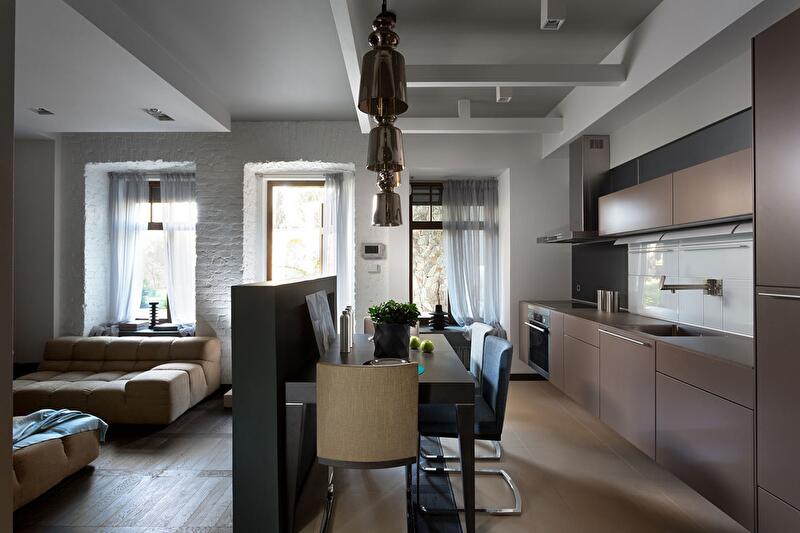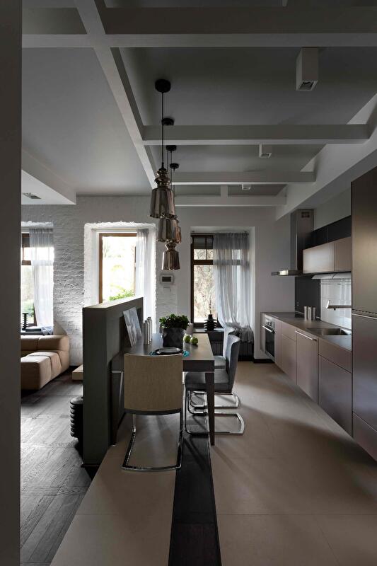 Кухня совмещена с гостиной, однако небольшая перегородка и ступенька зрительно разделяет обе функциональные зоны. С одной стороны перегородки находится обеденный стол, а другая служит опорой для телевизора. Нижние шкафы кухонного гарнитура не стоят на полу, они подвешены к стене, чтобы облегчить под ними уборку. Стена (с окнами) лишена отделки сознательно, она подчеркивает исторический дух местности и объединяет интерьер с садом. Белый тюль на окнах создает ощущение воздушности и легкости.