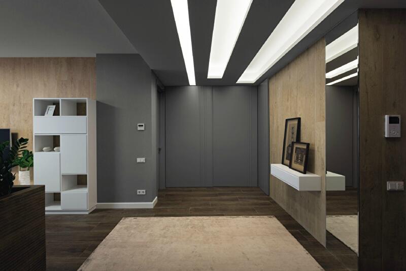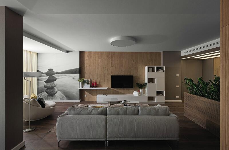 Ровно половину общей площади объекта занимает гостевое пространство: кухня-столовая, объединенная с входной зоной, плюс санузел. Общее настроение – отдохновенное. Основу цветовой гаммы составляют теплый серый, молочный и светло-коричневый. По спокойному фону жизнерадостными мазками прописаны акценты: ярко-желтым, зеленым, синим, красным. Атмосферу задают натуральные текстуры: деревянные панели в коридоре и гостиной, дубовая паркетная доска. Поверхность дверей имитирует древесный уголь. Ворсистые ковры напоминают то утоптанную грунтовку, то песчаный берег. Покрытые шпоном дуба кухонные шкафы оттенены настенной плиткой под белый мрамор.