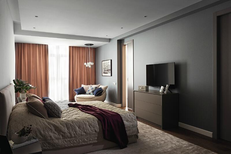 Общая стилистика подхвачена и в остальных помещениях квартиры, меняются лишь цветовые акценты. Так, в спальне появляются бордовый, голубой и теплый беж, в котором выполнены мебельная обивка, текстиль и ковер, – их уютные фактуры расслабляют вечером и бодрят утром.