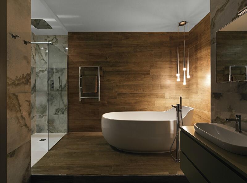 Санузел хозяев представляет собой отдельную комнату не только по площади, но и по настроению. Здесь можно находиться бесконечно долго: общаться, принимать тропический душ, лежа в ванне читать любимую книгу. И при этом чувствовать себя где-нибудь в лесу, на необитаемом острове – где можно, наконец, успокоиться, прийти в себя и восстановить силы.