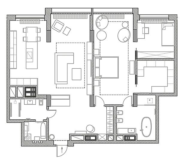 Примыкающие к помещению гардеробные комнаты – мужская и женская – являются элегантной и функциональной альтернативой массивным шкафам и прочей загружающей пространство мебели.