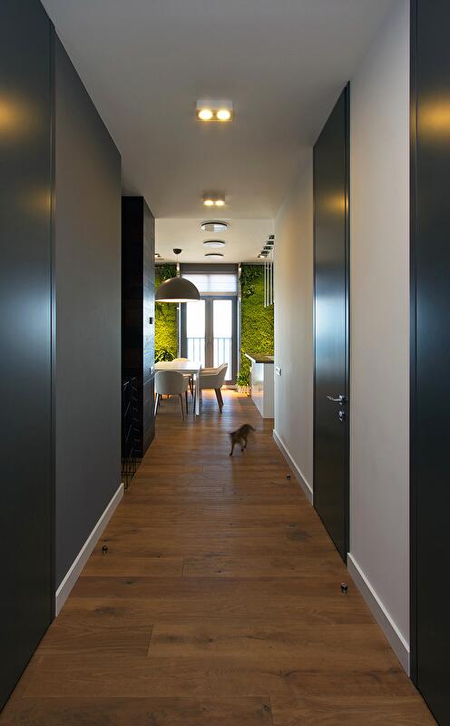 Панорамные окна резиденции открывают прекрасный вид на реку Днепр, поэтому в работе над проектом важно было продумать внутреннее наполнение, чтобы интерьер не затмевал и не сливался с пейзажем, а подчёркивал его как основное достоинство. Так появилась идея вертикального озеленения на простенках между окнами, послужившего порталом из уютной квартиры в просторы мегаполиса. Заказчики, молодая семейная пара с ребёнком, остались довольны таким лёгким интерьером, наполненным только светлыми оттенками. Теперь в их квартире всегда царит настоящая весна, а цветовая палитра гармонирует с панорамой местности. ![]()