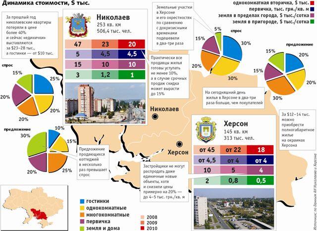 На рынке новостроек ситуация не отличается. Застройщики не могут распродать даже имеющиеся в городе единичные новые объекты (высотки есть в центре Херсона, районе хлопчатобумажного комбината, Таврическом микрорайоне), хотя и снизили цены примерно на 20% — до 4-5 тыс. грн./кв. м. К примеру, квартира в достроенном новом доме в центре города площадью 60 кв. м предлагается за $50 тыс., на ХБК апартаменты в 56 кв. м можно приобрести за $38 тыс., в Таврическом «единичку» в 37 кв. м — за $28 тыс. Поскольку покупателей все равно практически нет, некоторые застройщики даже согласны кредитовать их за свой счет, что, впрочем, пока не изменило ситуации.
