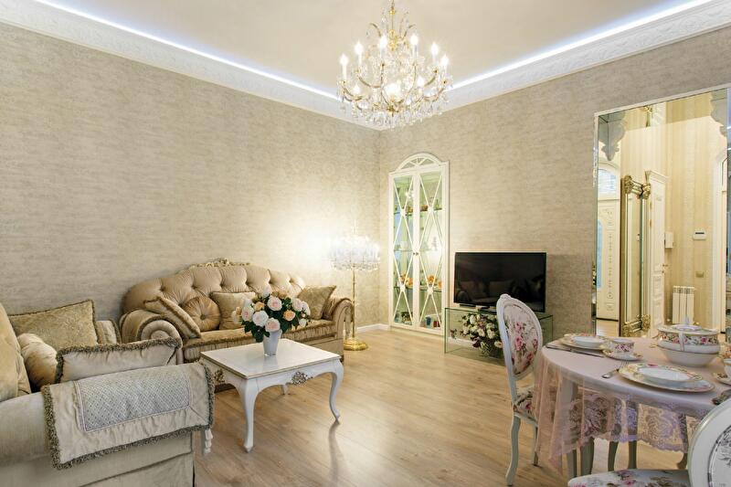 Необычное пожелание – обилие зеркал – обернулось оригинальным дизайнерским решением. В трехкомнатной квартире объединять помещения не стали: двухэтажный дом, в котором она расположена, принадлежит к старой застройке с большими ограничениями по перепланировке. Что можно, к примеру, поделать с метровой толщины несущими стенами, соединившими гостиную с кухней и прихожей двумя «нерушимыми» входными проемами? Тут очень кстати вспомнили о просьбе хозяйки. Порталы полностью зашили зеркалами (от дверей отказались), что облегчило массив стены и дало потрясающий эффект длинного, уходящего вдаль зеркального коридора.