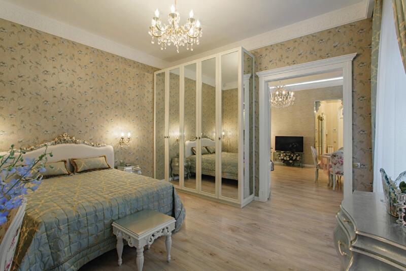 Убедившись в действенности выбранного метода, дизайнеры продолжили множить иллюзии, используя зеркала в качестве отдельных объектов, а также как материал для облицовки стен и даже мебели. Так между гостиной и гостевой спальней появился оригинальный предмет, шкаф на «две половины», встроенный на месте продленного до пола оконного проема. Со стороны гостиной он исполняет роль витрины для антиквариата с прозрачными стеклянными створками и зеркальной изнанкой, а со стороны спальни представляет собой полноценный гардероб с зеркальным фасадом.