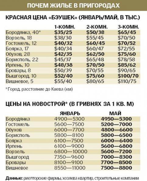 Хозяева сдаваемых в наем «хаток» поголовно перешли на оплату с долларов на гривни. Сей феномен они поясняют тем, что потенциальных клиентов пугали скачки доллара и до недавнего времени трудности с покупкой «зелени». И вслед за киевлянами в городах-спутниках многие продавцы квартир, не желая отдавать их задешево, сняли с продажи, надеясь на возобновление роста цен (ну-ну!), и пускают постояльцев. Сейчас по 1500—1800 грн. несложно найти самый ходовой «товар»: 1-комнатные квартиры в близлежащих Броварах, Борисполе, Вышгороде — на треть дешевле, чем в столице. Но касательно ближайших ценовых перспектив мнения риелторов разнятся.