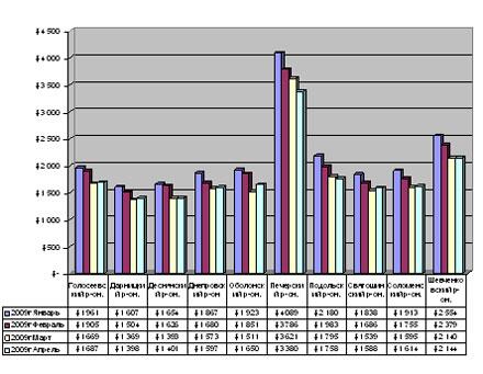 Наиболее низкие цены зафиксированы в Дарницком (в апреле $1398/кв. м, в марте - $1369) и Деснянском (в апреле $1401/кв. м, в марте - $1393) районах.
