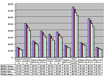 Наиболее популярным остаются Киево-Святошинский (в апреле $6229/кв. м, в марте - $6640), Обуховский (в апреле $4554/кв. м, в марте - $5028) и Бориспольский (в апреле $3938/кв. м, в марте - $4407) районы.