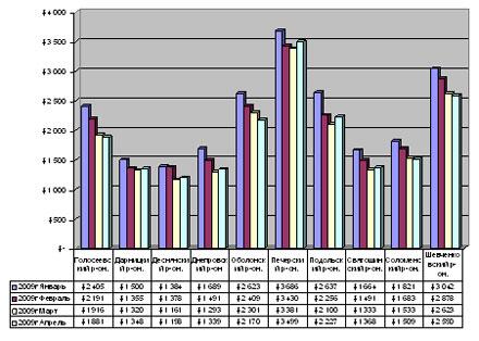 Наиболее низкие цены зафиксированы в Дарницком (в апреле $1398/кв. м, в марте - $1369) и Деснянском (в апреле $1401/кв. м, в марте - $1393) районах.
