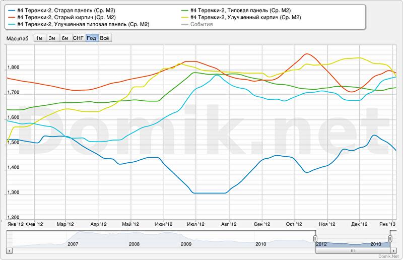 В наиболее массовом сегменте старого фонда — домах серии «типовая панель» - цена на квартиры выросла менее значительно — на 5,4 % и, на конец 2012 года, составила $ 1724/кв.м.