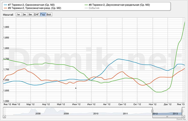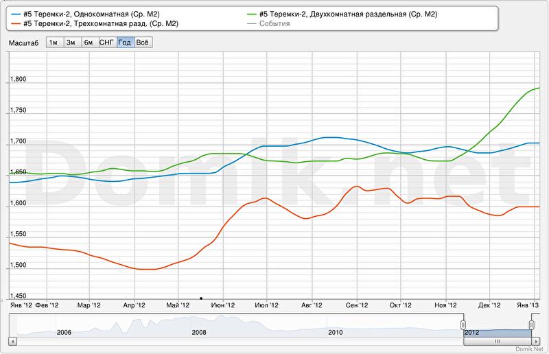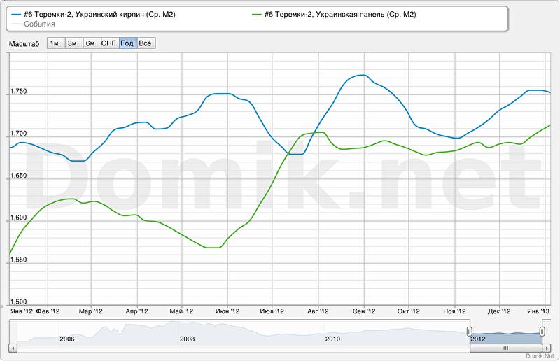 Как мы видим, ценовые тенденции на Теремках-2 противоречивы. С одной стороны, они вписываются в общегородской тренд роста стоимости квартир на окраинах Киева. С другой, Теремки – не тот массив, где цены на квартиры низкие: здесь и достаточно высокая цена квадратного метра жилья, и просторные планировки. Вероятно, высокую для окраины стоимость жилья на массиве обуславливают развитая инфраструктура, удобное транспортное сообщение, наличие большого количества зеленых зон и относительно благоприятная экология. А вот продлится ли эта тенденция в будущем, неизвестно, учитывая изменение по городу отдельных, казавшихся стабильными, трендов в декабре 2012.