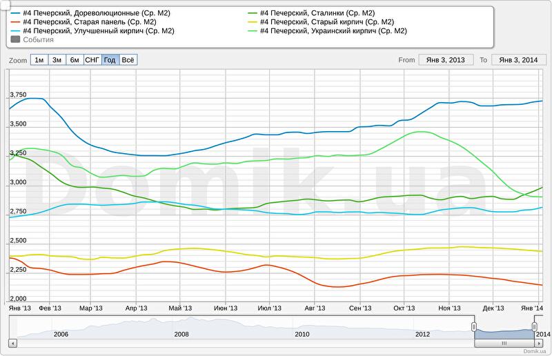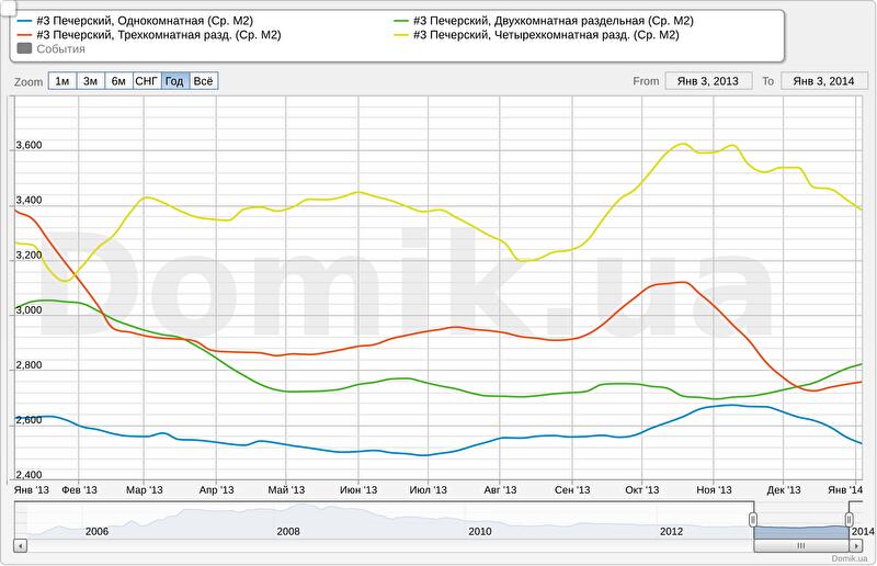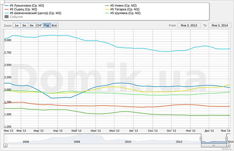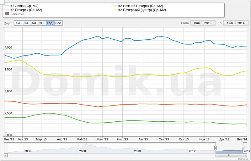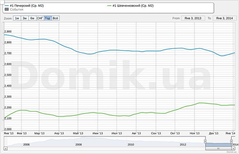 По итогам 2013 года самые высокие показатели снижения и роста цены наблюдались в двух центральных районах Киева — Печерском и Шевченковском: в Печерском районе в 2013 году цены упали в целом на 5,7%, в Шевченковском настолько же выросли.