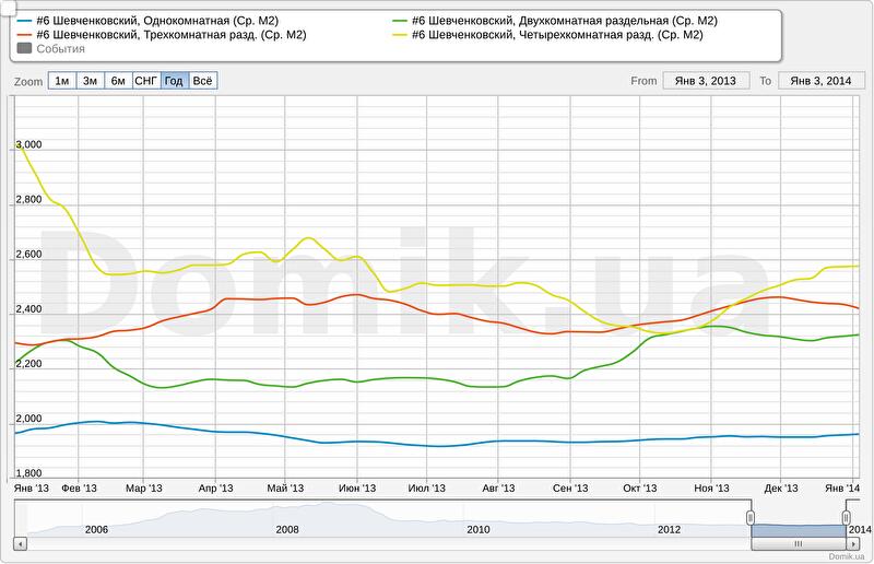 Рост цен в целом по Шевченковскому району обусловлен также подорожанием двух- и трехкомнатных квартир. Двухкомнатные подорожали на 4,4%, трехкомнатные — на 5,6%. Однокомнатные в конце 2013 стоили столько же, сколько и в начале, хотя в течение года наблюдались заметные колебания. А вот четырехкомнатные подешевели на 15%. Правда, этот сегмент, во-первых, немногочисленен, а во-вторых, в конце 2012 — начале 2013 для него был характерен заметный, но непродолжительный рост цен.
