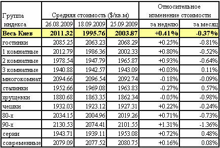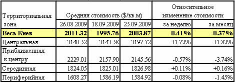C 18 по 25 сентября 2009 г средняя стоимость жилых квартир в Киеве повысилась на $8.11/кв.м/ (0.41%). В течение всего сентября средняя стоимость квартир колебалась около $2000/кв.м (см. Таблицу 1.). Об этом ЛІГАБізнесІнформ сообщили в аналитическом отделе Союза специалистов по недвижимости Украины (ССНУ).