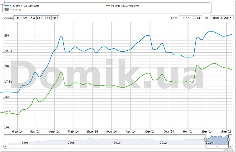 В течение 2014 года рост цен в гривне коснулся квартир с разными типами стен практически в равной степени. Квартиры в панельных (в том числе, бетонно-блочных) домах в среднем подорожали до 20 303 грн. за кв.м (+64,0%). Примерно на столько же подорожали квартиры и в кирпичных домах, где средняя стоимость квадратного метра составила 25 617 грн (+63,5%).