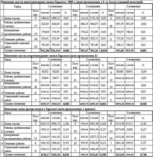 Таблица 1. Цены на жилье в Харькове на 15.09.2009. (*)