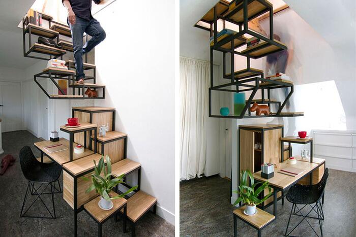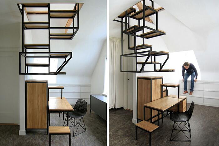 Чтобы максимизировать функциональность такого объекта, дизайнер из Нидерландов Mieke Meijer спроектировал конструкцию, которая является одновременно лестницей, письменным столом и стеллажом для хранения книг и других предметов.