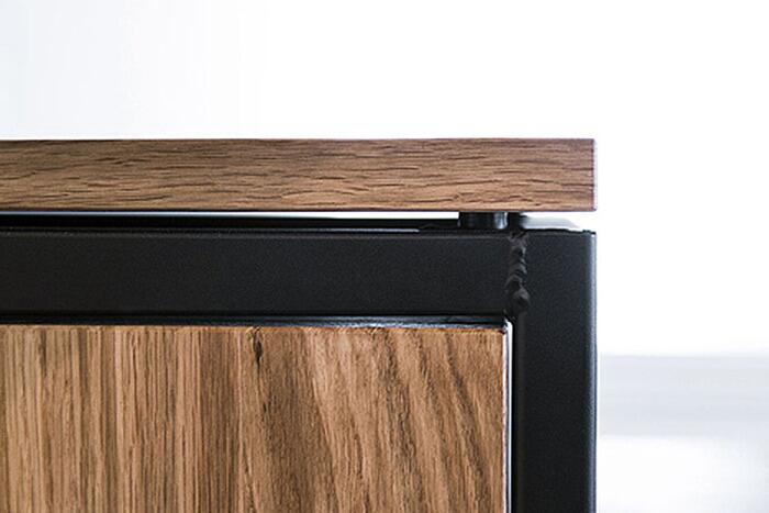 Здесь есть открытые и закрытые боксы, полки, подставки для цветочных вазонов, книг или оргтехники. Основой конструкции является каркас из металла, окрашенный в черный цвет, и светлая древесина дуба.