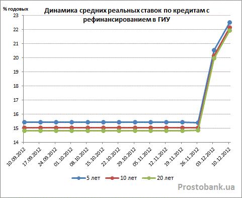 Но более всего подорожание коснулось кредитов с рефинансированием в ГИУ, которые еще в прошлом месяце представляли собой наиболее выгодные предложения ипотечного рынка. В декбре-2012 средние реальные ставки по ним выросли в полтора раза, достигли 22,15%-22,95% годовых и сравнялись со среднерыночной стоимостью обычных займов без поддержки ГИУ.