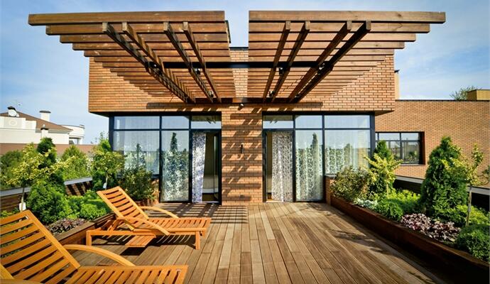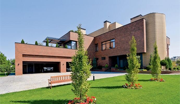 Архитектор Иван Юнаков вместе с заказчиком, человеком прогрессивным и много путешествующим, пошли на эксперимент: довериться друг другу, не оглядываться на шаблоны современных украинских «маєтків» и строить то, что будет актуальным сегодня, завтра и послезавтра, то есть лаконичную индивидуальную архитектуру. У дома два этажа и три полноценные террасы — на каждом уровне дома и сверху, на плоской крыше. Каждая из них сделана по всем стандартам зеленой кровли — деревянный настил перемежают не просто растения в кадках, а настоящий грунт и капельный полив. Причем для каждой террасы расписаны «сценарии» цветения, так что в разные времена года активны разные зоны. Наиболее нестандартный вариант — верхняя терраса: помимо роскошного озеленения (с барбарисом и душистой лавандой), здесь есть также зона барбекю, столовая группа, зона отдыха и качели.