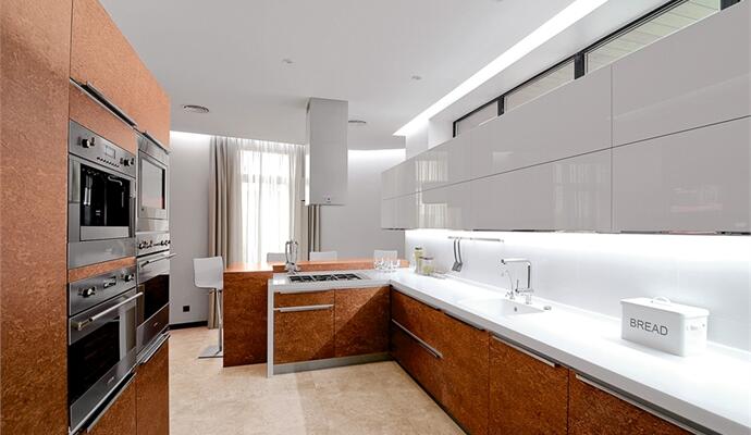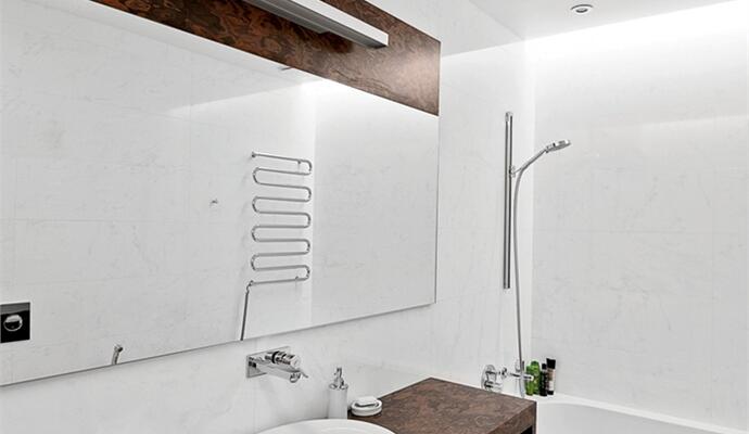 В целом для всех помещений взят лаконичный декораторский тон с ненавязчивым набором выразительных средств: цвет (чистый белый перемежают акценты терракоты, антрацита, кофе с молоком), свет (в основном это скрытое освещение с точечным вкраплением дизайнерских светильников Flos ) и фактура (дерево, кирпичная кладка, покраска; в индивидуально спроектированной мебели и дверях — активное использование натурального шпона ореха). За персонализацию пространства отвечает также хорошая коллекция живописи. Ни одного лишнего движения или штриха — в этом доме ценят также экологию мысли.